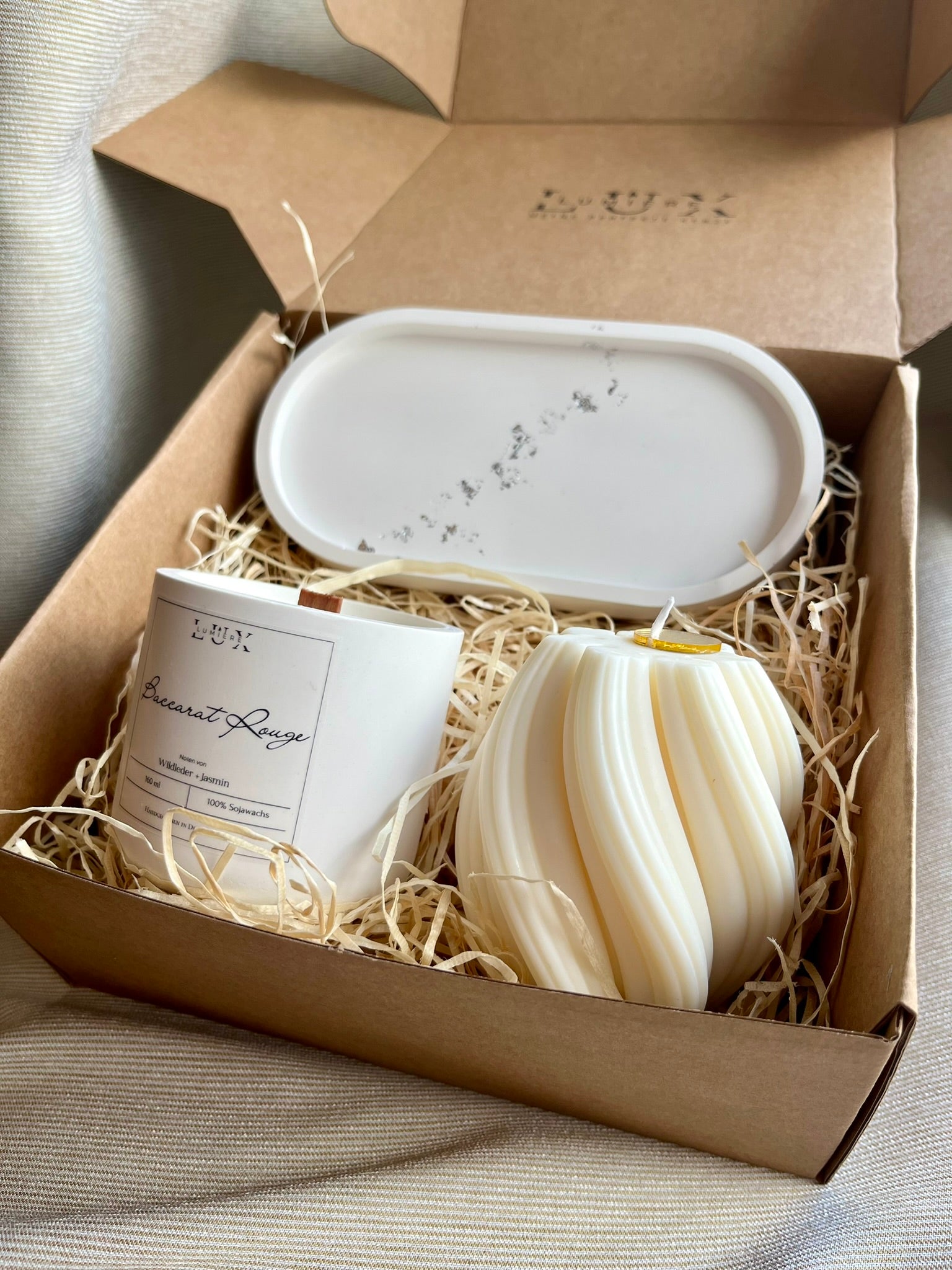 Mit einer Auswahl an hochwertigen Kerzen auf einem eleganten Tablett mit Silberakzenten und dem herrlichen Duft von der Aromakerze "Baccarat Rouge" und der Formkerze "Swirl", ist dieses, mit viel Liebe verpacktes Geschenkeset, perfekt für jeden Anlass.