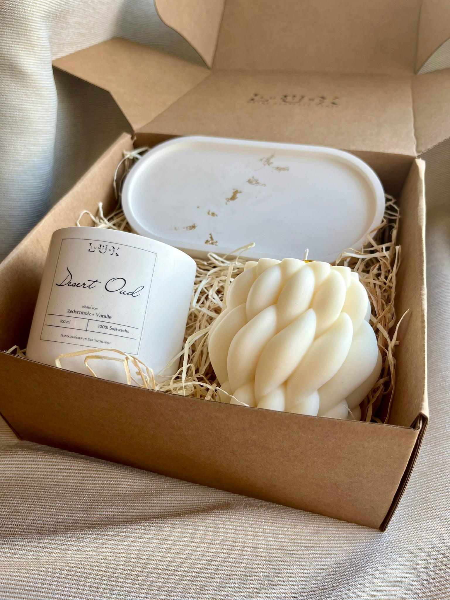 Mit einer Auswahl an hochwertigen Kerzen auf einem eleganten Tablett mit Goldakzenten und dem herrlichen Duft von der Aromakerze "Desert Oud" und der Formkerze "Braid", ist dieses, mit viel Liebe verpacktes Geschenkeset, perfekt für jeden Anlass.