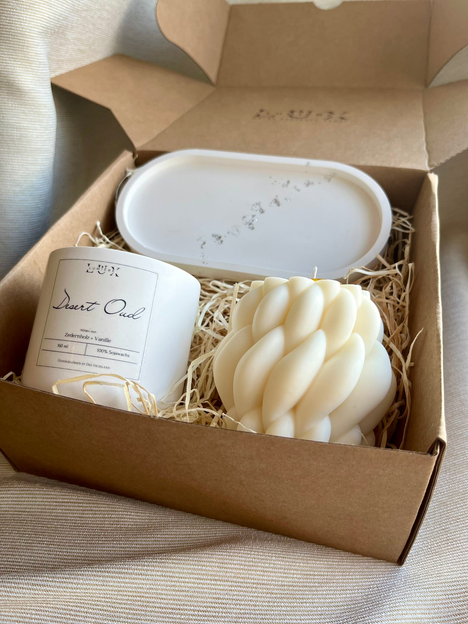 Mit einer Auswahl an hochwertigen Kerzen auf einem eleganten Tablett mit Silberakzenten und dem herrlichen Duft von der Aromakerze "Desert Oud" und der Formkerze "Braid", ist dieses, mit viel Liebe verpacktes Geschenkeset, perfekt für jeden Anlass.