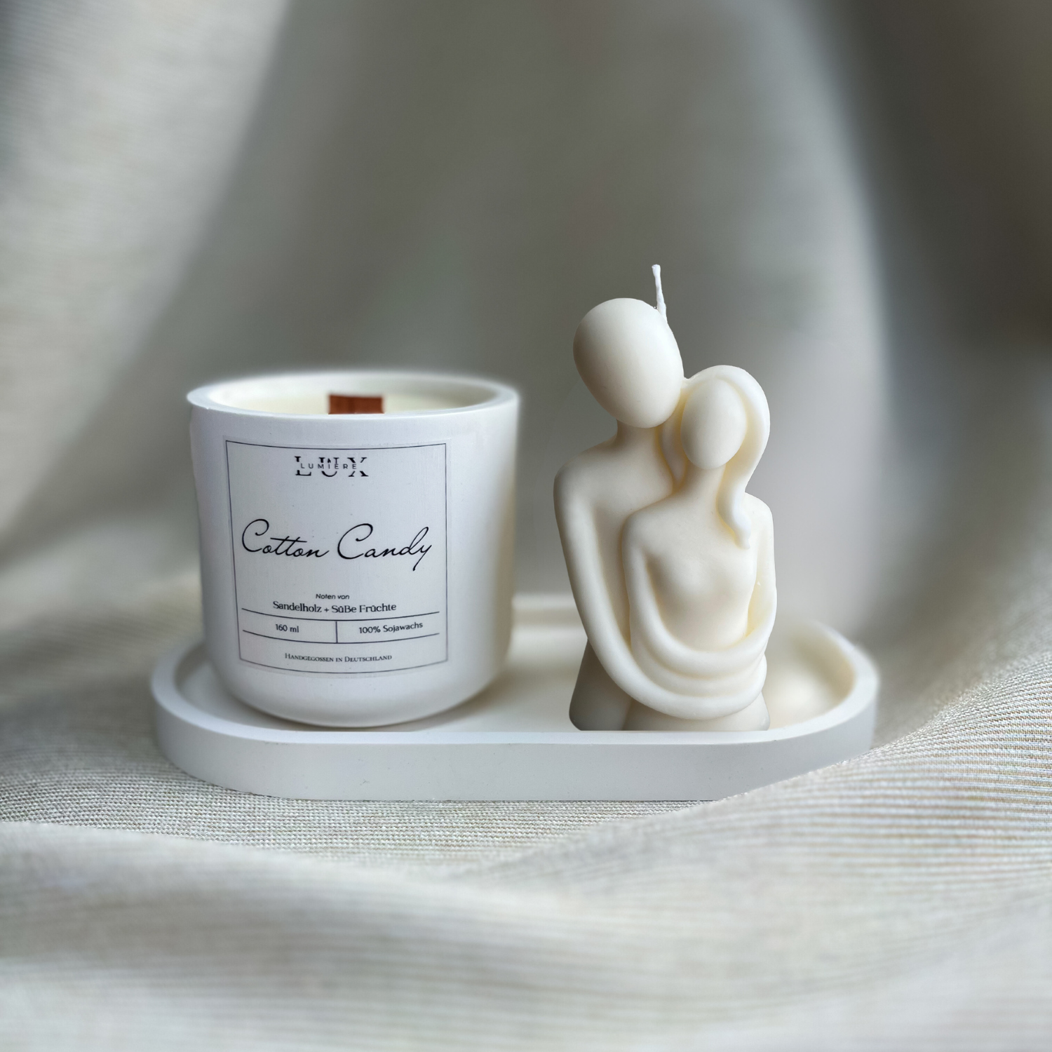 Mit einer Auswahl an hochwertigen Kerzen auf einem eleganten, reinweißen Tablett und dem herrlichen Duft von der Aromakerze "Cotton Candy" und der Formkerze "Couple", ist dieses, mit viel Liebe verpacktes Geschenkeset, perfekt für jeden Anlass.