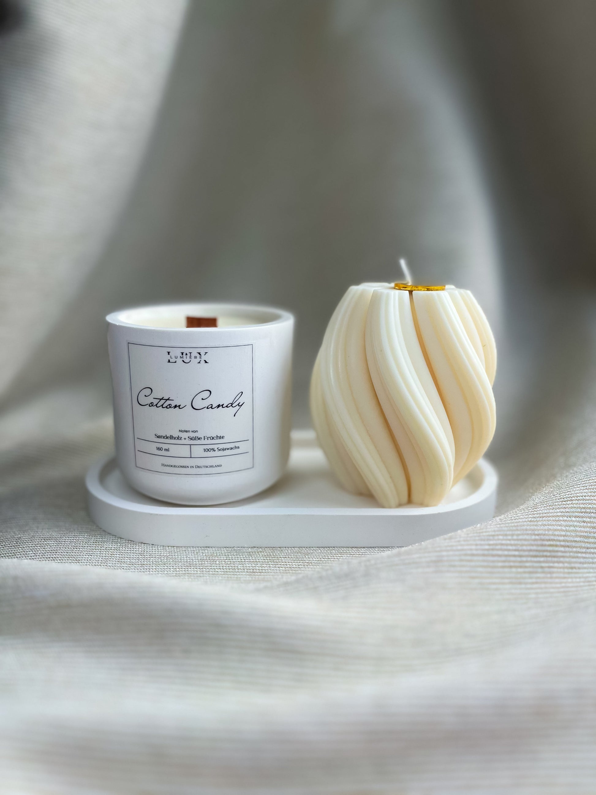 Mit einer Auswahl an hochwertigen Kerzen auf einem eleganten, reinweißen Tablett und dem herrlichen Duft von der Aromakerze "Cotton Candy" und der Formkerze "Swirl", ist dieses, mit viel Liebe verpacktes Geschenkeset, perfekt für jeden Anlass.