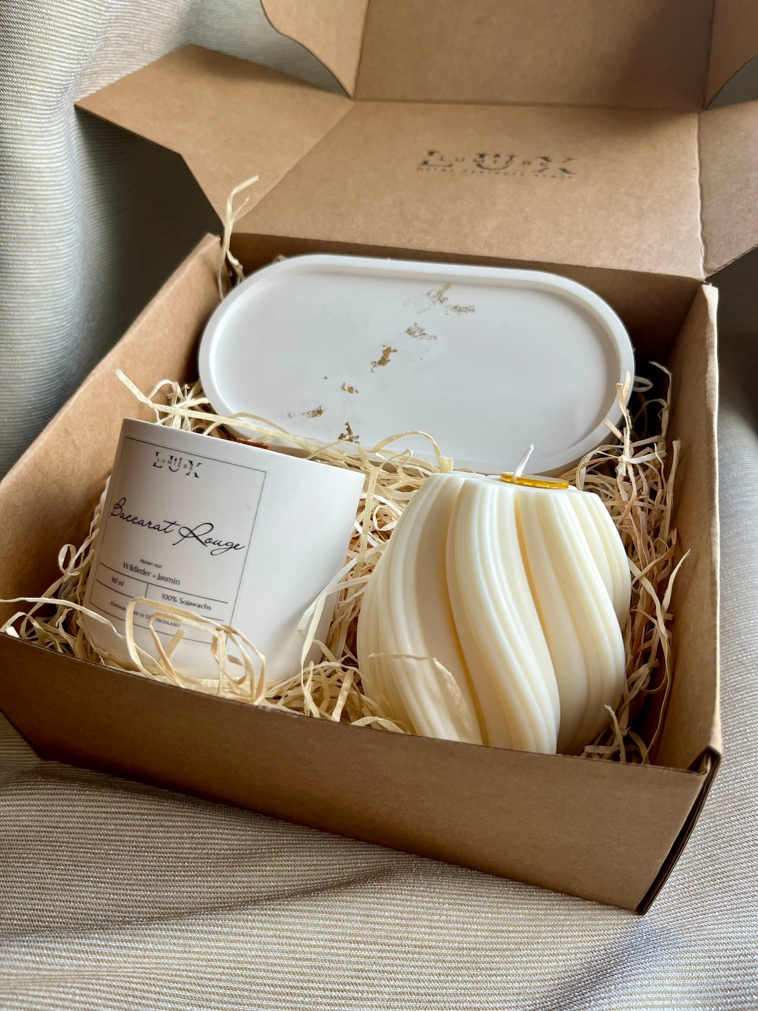 Mit einer Auswahl an hochwertigen Kerzen auf einem eleganten Tablett mit Goldakzenten und dem herrlichen Duft von der Aromakerze "Baccarat Rouge" und der Formkerze "Swirl", ist dieses, mit viel Liebe verpacktes Geschenkeset, perfekt für jeden Anlass.